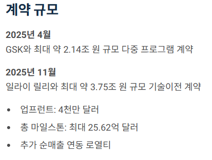 경쟁력은 세 가지입니다. 첫째, 2025-04 GSK 딜(총액 최대 약 2.14조 원)에 이어, 2025-11 일라이 릴리와 업프런트 4천만 달러·총액 최대 약 25.62억 달러 + 순매출 연동 로열티의 대형 계약을 연속 성사했습니다.