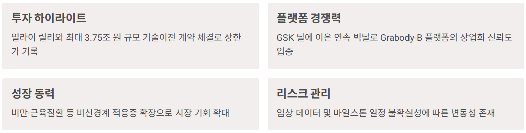 요약: 2025년 GSK→릴리 연속 대형 딜로 플랫폼 신뢰와 적응증 확장성을 확인했습니다. 다만 임상 데이터·일정이라는 본질 변수가 주가의 중장기 방향을 좌우합니다. 단기에는 과열 구간의 변동성에 대비해 분할·규칙 기반 접근을, 스윙에는 이벤트 캘린더 연동 전략을, 중장기에는 상업화 가시성 상승 시 밸류 상단 재평가 가능성을 염두에 둔 누적 매수 전략이 합리적입니다.