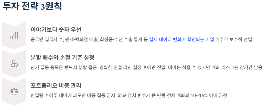 투자 전략 측면에서 제안할 수 있는 접근법은 세 가지입니다. 첫째, ‘이야기’보다 ‘숫자’를 우선하는 원칙입니다. 중국인 입국자 수, 면세·백화점 매출, 화장품·수산 수출 통계 등 실제 데이터의 변화가 확인되는 기업 위주로 보수적으로 선별하는 것이 좋습니다. 둘째, 이미 단기 급등한 종목은 반드시 분할 접근과 손절 기준을 설정한 상태에서만 대응해야 합니다. 셋째, 포트폴리오 내 비중을 한일령 수혜주 테마에 과도하게 쏠리지 않게 관리하는 것이 중요합니다. 테마는 언제든 식을 수 있지만, 계좌 전체의 리스크는 장기간 남을 수 있기 때문입니다.