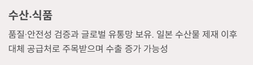 | 수산·식품 | 수산 가공식품, 원양어업·식품 수출 |
