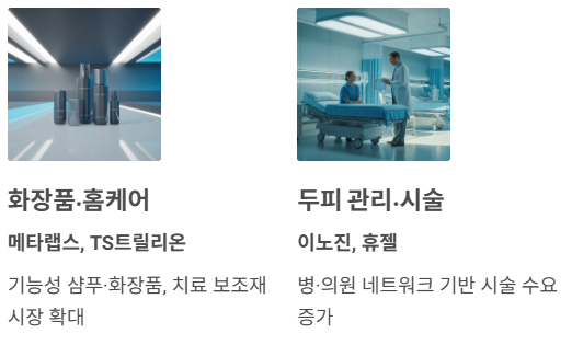 | 두피·피부 의료기기 | 레이저·고주파 장비 | 병·의원 네트워크 강점 | 시술 수요 증가 |