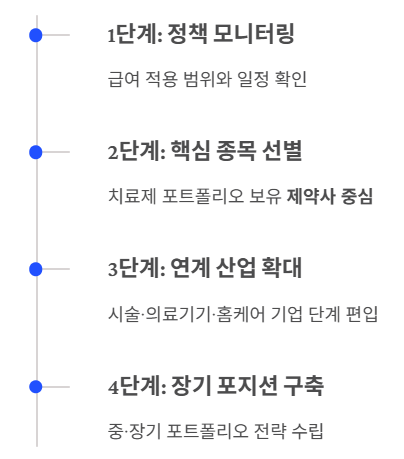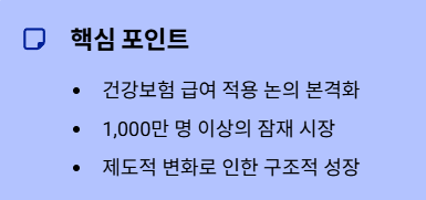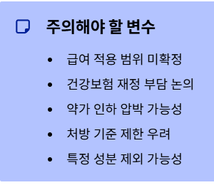 다만 리스크 요인도 명확합니다. 급여 적용 여부와 범위는 아직 확정되지 않았으며, 건강보험 재정 부담에 대한 사회적 논의가 필요합니다. 또한 약가 인하 압박, 처방 기준 제한, 특정 성분 제외 가능성 등은 투자 시 반드시 고려해야 할 정책 리스크입니다.