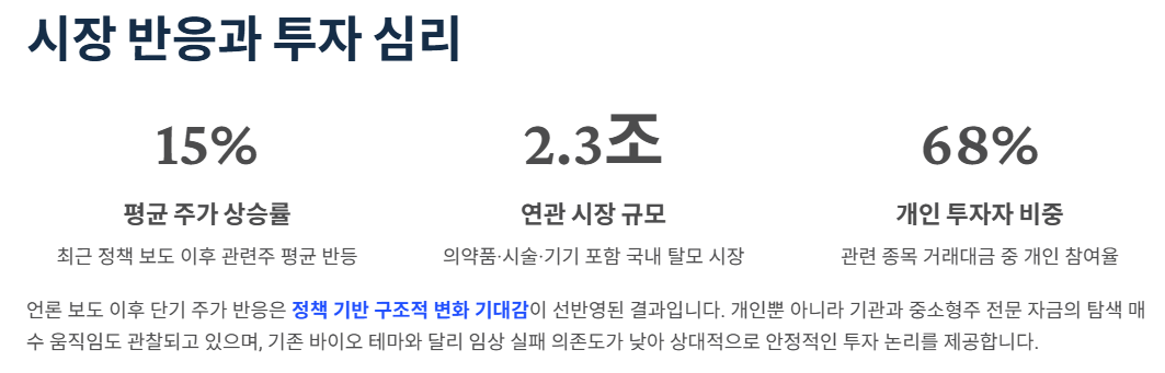 최근 언론 보도 이후 국내 증시에서는 탈모 치료제 관련 종목들을 중심으로 단기적인 주가 반응이 나타났습니다. 이는 단순한 이슈성 테마가 아니라, 정책 기반 구조적 변화 기대감이 선반영된 결과로 해석됩니다. 특히 개인 투자자뿐 아니라 일부 기관과 중소형주 전문 자금의 탐색 매수 움직임도 관찰되고 있습니다.