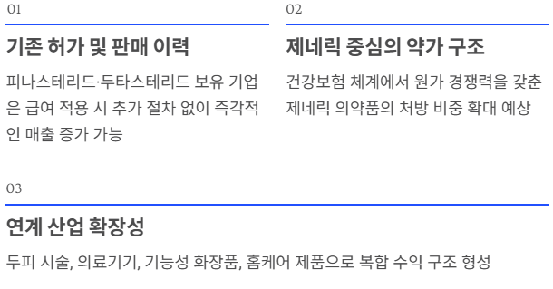 셋째는 연계 산업 확장성입니다. 탈모 치료는 단일 의약품 소비에 그치지 않고, 두피 시술, 의료기기, 기능성 화장품, 홈케어 제품으로 자연스럽게 확장됩니다. 이는 단기 매출 증가를 넘어 복합적인 수익 구조를 형성하게 됩니다.