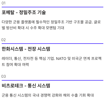 | LIG넥스원 | 유도무기/전술무기 | 미국·EU 협업 확대 | 국방비 확대 수혜 예상 |