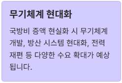 > 핵심 포인트: 위 종목들은 방산 생태계 전반을 구성하며, 국방비 확대 시 수혜가 직·간접적으로 확산될 수 있는 구조입니다.