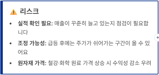 리스크: 매출이 꾸준히 늘고 있는지 더 확인이 필요합니다. 또 최근 주가가 빠르게 올라 조정이 올 수 있습니다. 원자재 가격이 오르면 수익이 줄 수도 있습니다.