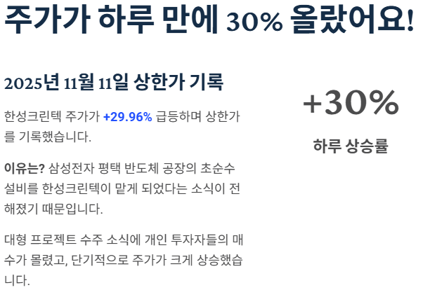 2025년 11월 11일 기준, 한성크린텍 주가는 하루 동안 크게 올라 상한가(+29.96%)를 기록했습니다. 이유는 삼성전자 평택 반도체 공장의 초순수 설비를 맡게 됐다는 소식이 전해졌기 때문입니다. 이런 뉴스가 나오면 개인 투자자들의 매수가 몰리고, 단기적으로 주가가 급등할 수 있습니다. 다만 그다음에는 쉬어가는 흐름이 나올 수도 있습니다.