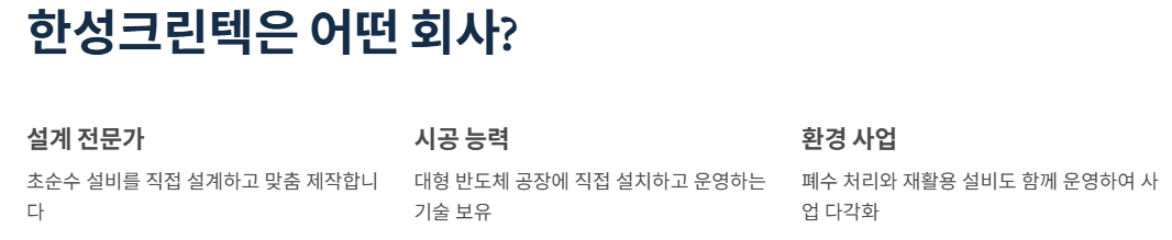 강점: 한성크린텍은 초순수 설비를 직접 설계하고 시공할 수 있습니다. 대형 공장 납품 경험도 있고, 환경 설비 사업도 함께 하고 있어 한쪽에만 의존하지 않습니다.