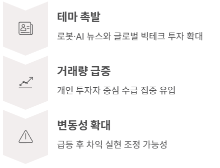 단기 급등 이후에는 조정 가능성을 항상 염두에 두고, 중장기적으로는 로봇 산업 확장 흐름이 유지되는지를 기준으로 비중 조절 전략을 고려하는 것이 합리적입니다.