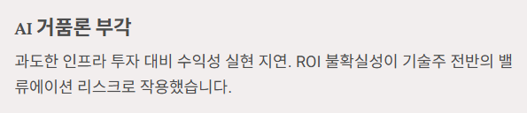 | AI 인프라 | GPU, 서버, 데이터센터 | 미·중·한 경쟁 구도 | 설비 투자 과열, 거품론 논란 |