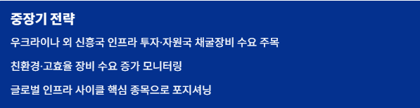 | HD현대건설기계 | 중대형 건설장비 | 건설·토목 현장 장비 공급, 인프라·플랜트 재건 참여 기대 |
