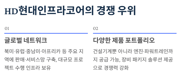 또한 일부 리포트에서는 HD현대건설기계와 함께 “건설기계 3총사”로 묶으면서도, 수급 측면에서는 HD현대인프라코어가 상대적으로 우위에 있다고 평가합니다. 글로벌 브랜드 인지도, 다양한 시장 포트폴리오, 엔진 사업 시너지가 복합적으로 작용하고 있기 때문입니다.